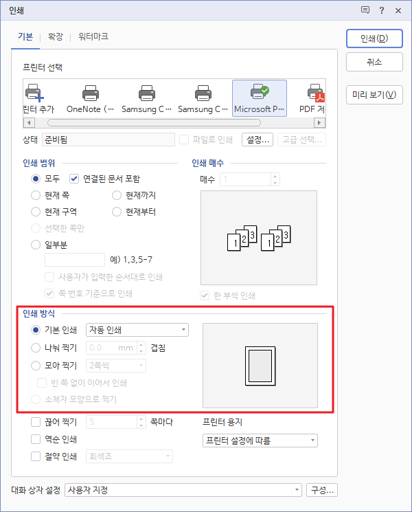한글 파일 내 인쇄 방식은 변경이 되지않습니다.