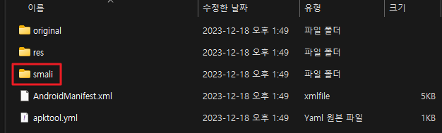 apktool 디코딩 도구를 이용하여 dex 파일을 smali 코드로 디코딩합니다.
