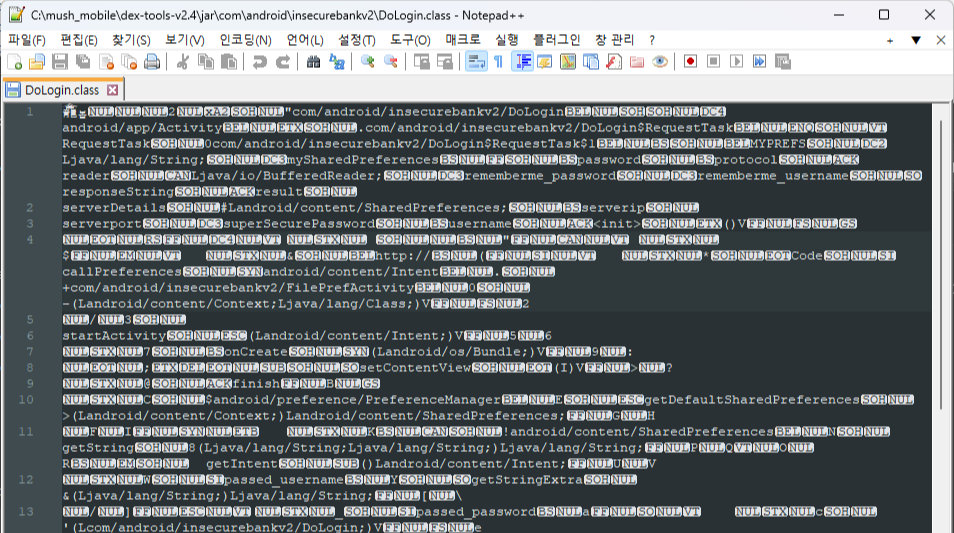 핵심 파일은 dex 파일이며, notepadd++을 통해 열면 파일 내용을 파악하기가 힘듭니다.